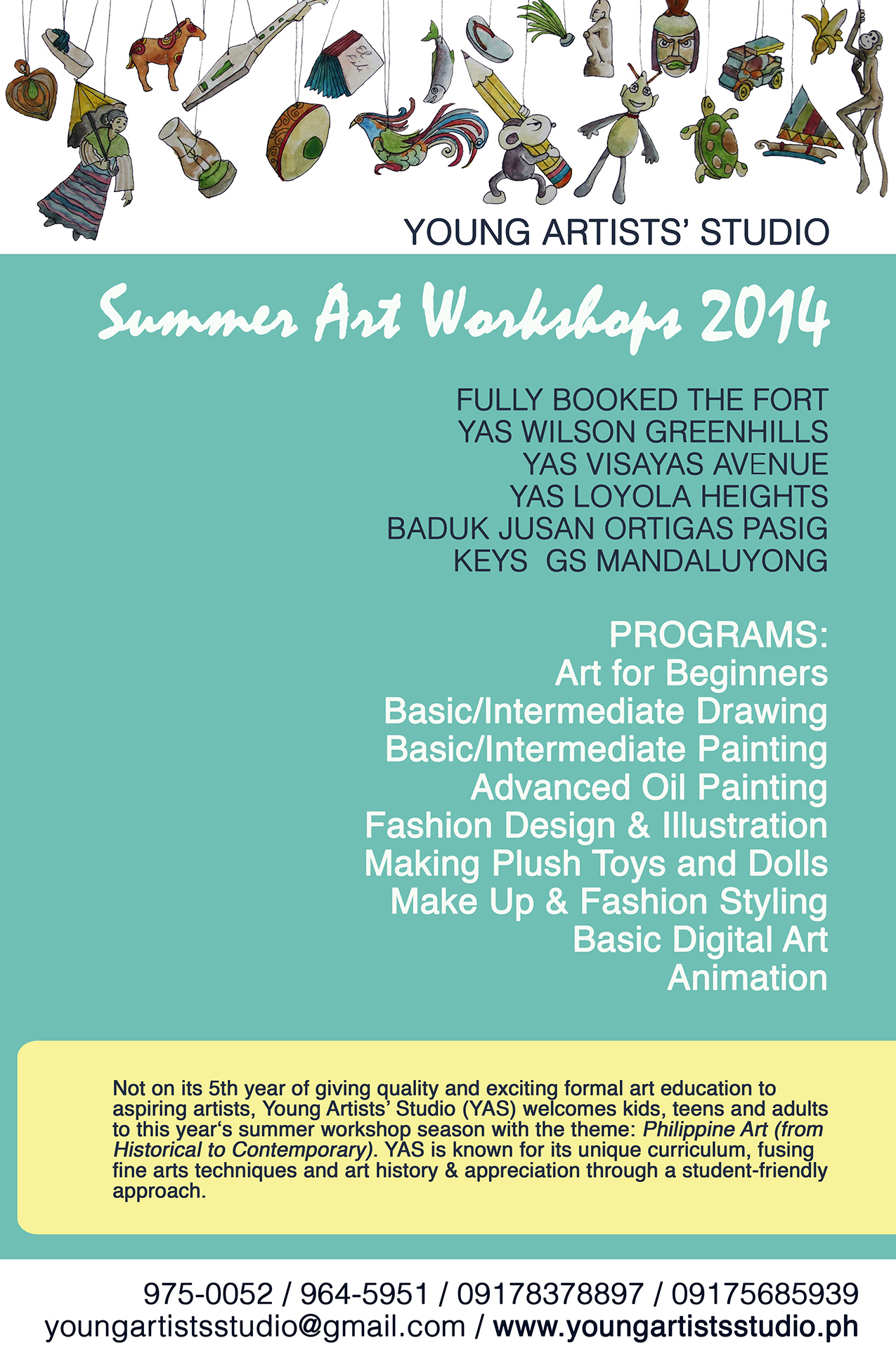 YAS SUMMER 2014 general flyer_front_lowres Published: March 10, 2014Full size: 1275 × 1950Attached: Summer Art Workshops 2014 by Young Artists’ Studio « » YAS SUMMER WORKSHOPS 2014