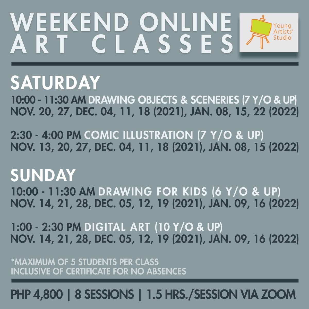 (01_01 dates only) Weekend Online Art Class poster_Drawing Class Published: November 3, 2021Full size: 3600 × 3600Attached: ART CLASSES for all ages « » Like Loading...