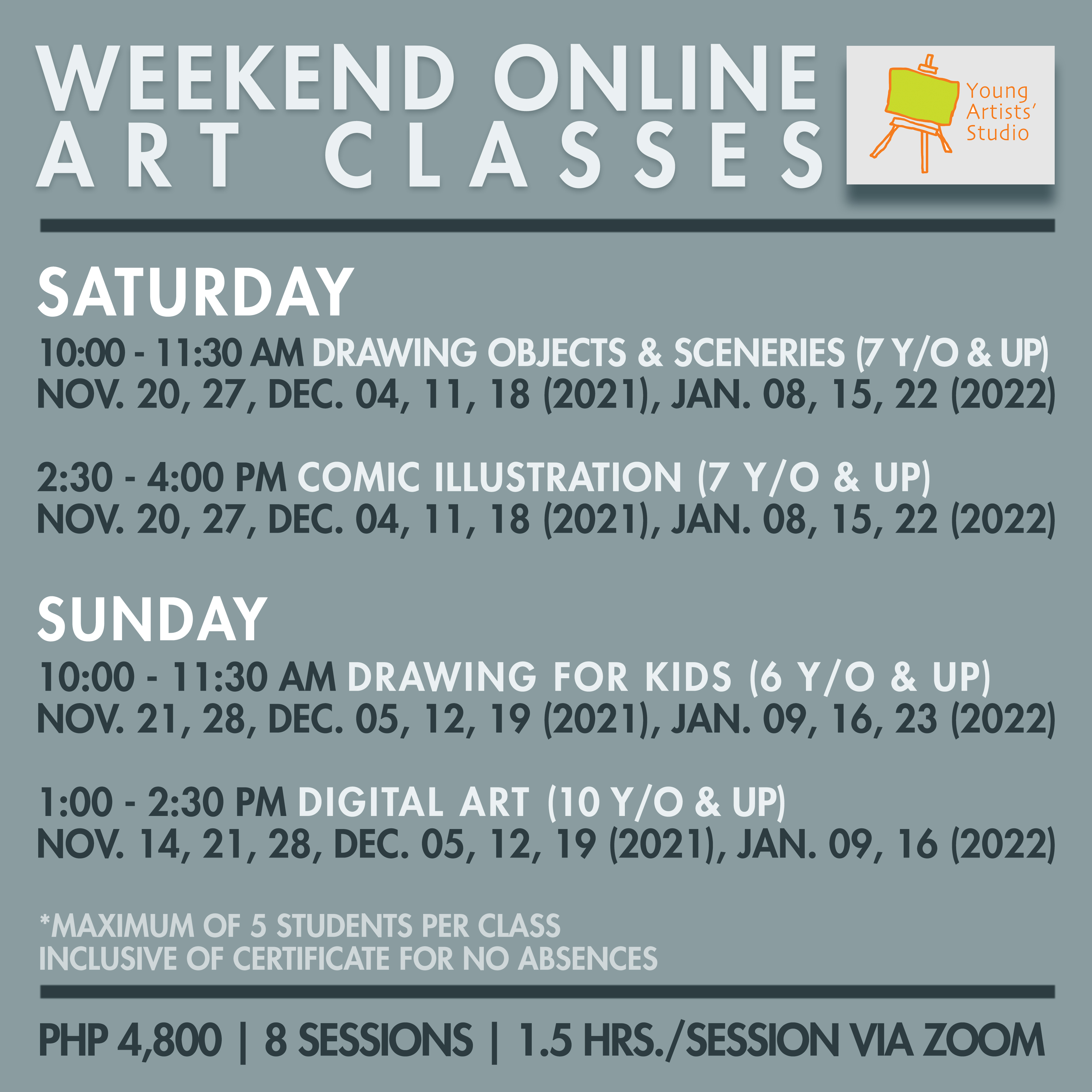 (01_01 dates only) Weekend Online Art Class poster_Drawing Class Published: November 11, 2021Full size: 3600 × 3600Attached: ART CLASSES for all ages « » Like Loading...