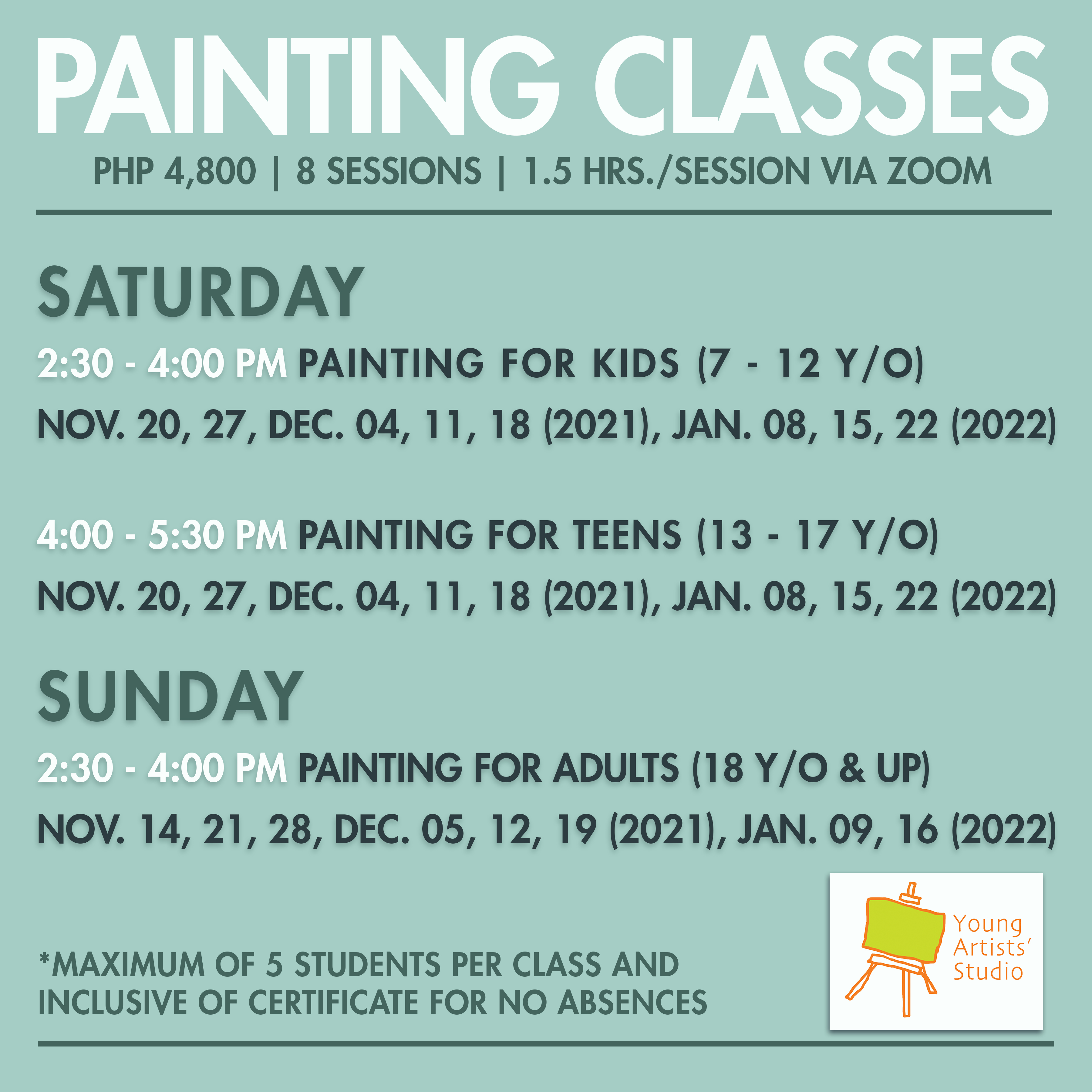 (02_01 dates only) Weekend Online Art Class poster_Painting Class Published: November 11, 2021Full size: 3600 × 3600Attached: ART CLASSES for all ages « » Like Loading...