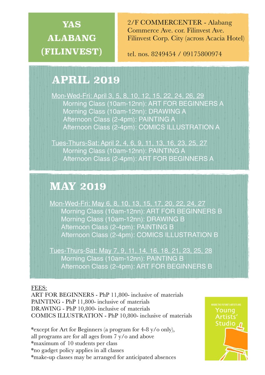 YAS Summer 2019 Schedules_Alabang Published: March 5, 2019Full size: 1500 × 2122Attached: ART CLASSES for all ages « » YAS Alabang Like Loading...