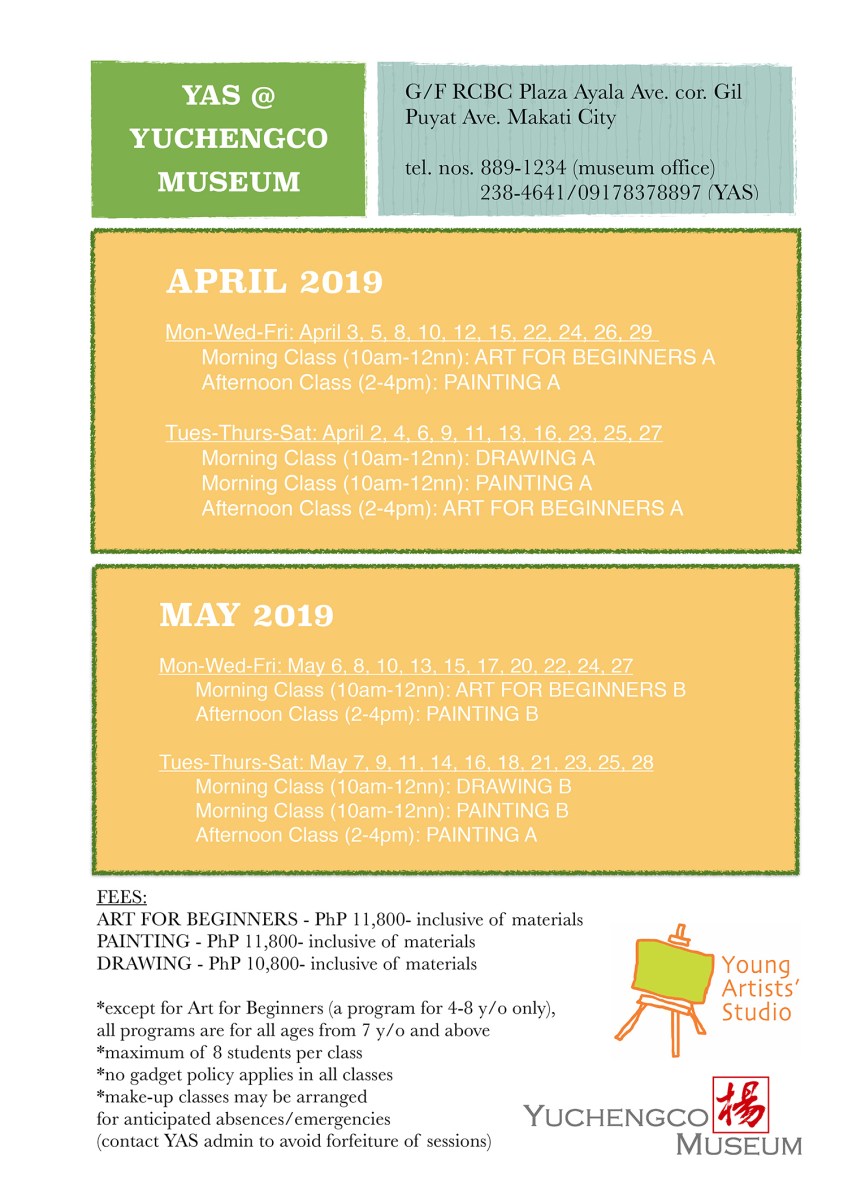 YAS Summer 2019 Schedules_Yuchengco Museum Published: March 5, 2019Full size: 1500 × 2122Attached: ART CLASSES for all ages « » YAS @ Yuchengco Museum Like Loading...